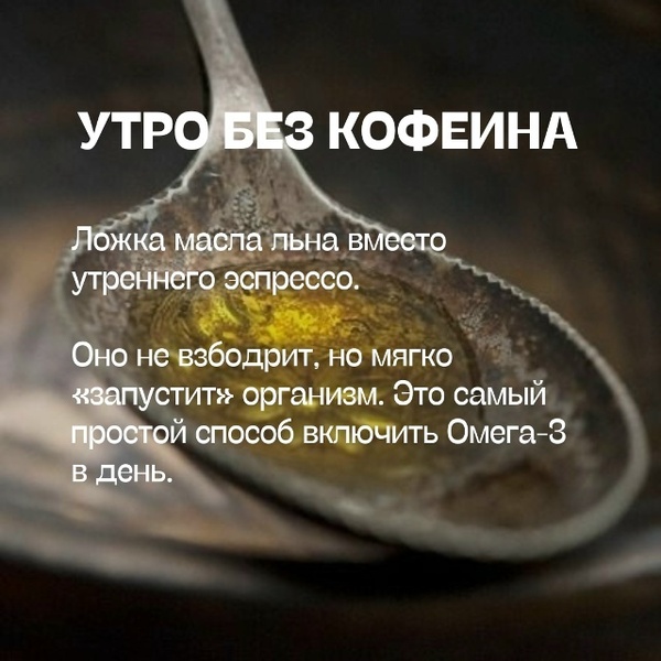 Ложка масла льна вместо утреннего эспрессо. Оно не взбодрит, но мягко "запустит" организм. Это самый простой способ включить Омега-3 в день.