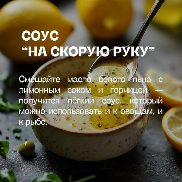 Смешайте масло белого льна с лимонным соком и горчицей - получится лёгкий соус, который можно использовать и к овощам, и к рыбе.