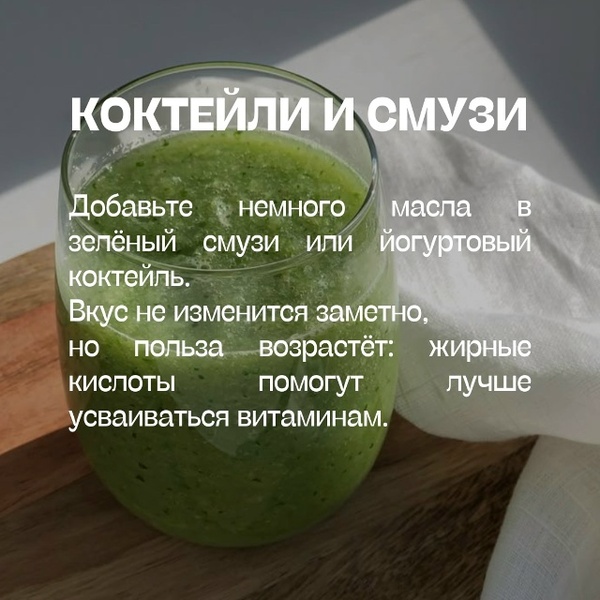 Добавьте немного масла в зелёный смузи или йогуртовый коктейль. Вкус не изменится заметно, но польза возрастёт: жирные кислоты помогут лучше усваиваться витаминам.